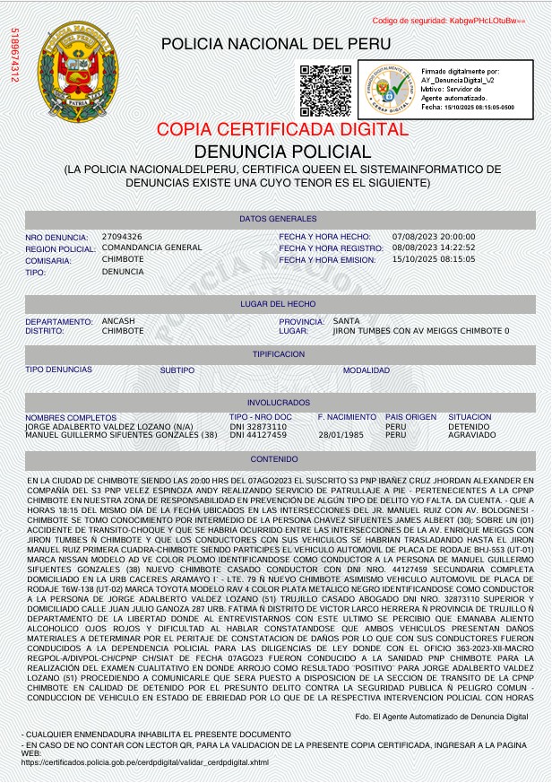 El hecho se originó el 07 de agosto de 2023, cuando Valdez Lozano participó en un accidente de tránsito. El Acta de Intervención Policial N° 158 de la Comisaría de Chimbote detalla que el conductor «emanaba aliento alcoholico, ojos rojos y dificultad al hablar», y que el examen cualitativo en la Sanidad PNP arrojó resultado «POSITIVO» para alcohol. Por ello, Valdez Lozano fue detenido por el presunto delito contra la Seguridad Pública – Conducción en Estado de Ebriedad. La Municipalidad Provincial del Santa impuso la papeleta por la infracción M-01.