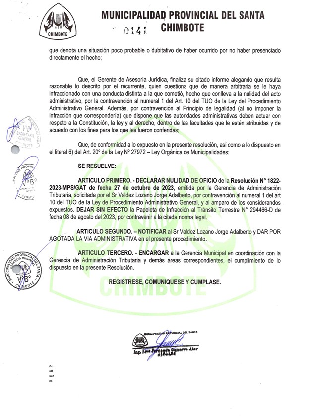La Resolución de Alcaldía N° 0141-2025-A-MPS declaró la Nulidad de Oficio de la multa y ordenó dejar sin efecto la papeleta. El fundamento legal fue la contravención al Principio de Legalidad (Art. 10.1 del TUO de la Ley del Procedimiento Administrativo General). Específicamente, la autoridad superior determinó un vicio formal en la Resolución de Multa inicial: declarar a la copropietaria del vehículo, María Catherine Burga Ruiz, como responsable y deudora solidaria del pago, una responsabilidad no aplicable para la infracción M-01. Además, el expediente registró una controversia respecto al lugar del accidente, ya que el acta policial consignó el Jirón Tumbes con la Avenida Meiggs, mientras el conductor alegó que la intervención se produjo en el Jirón Manuel Ruiz.