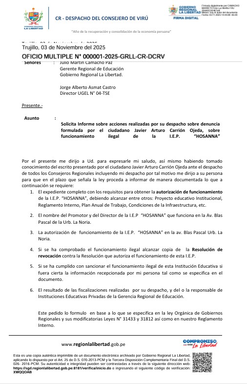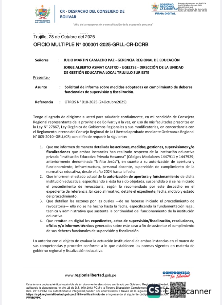 Por su parte, la consejera Camacho Barreto, mediante el Oficio Múltiple N.° 000001-2025-GRLL-CR-DCRV del 3 de noviembre, solicitó el expediente completo de autorización de funcionamiento del colegio, la identificación del promotor y del director, así como copia de la resolución que autoriza o revoca el permiso de funcionamiento. Además, exigió información sobre las fiscalizaciones realizadas y la identificación de los responsables del área de instituciones privadas dentro de la GRELL.