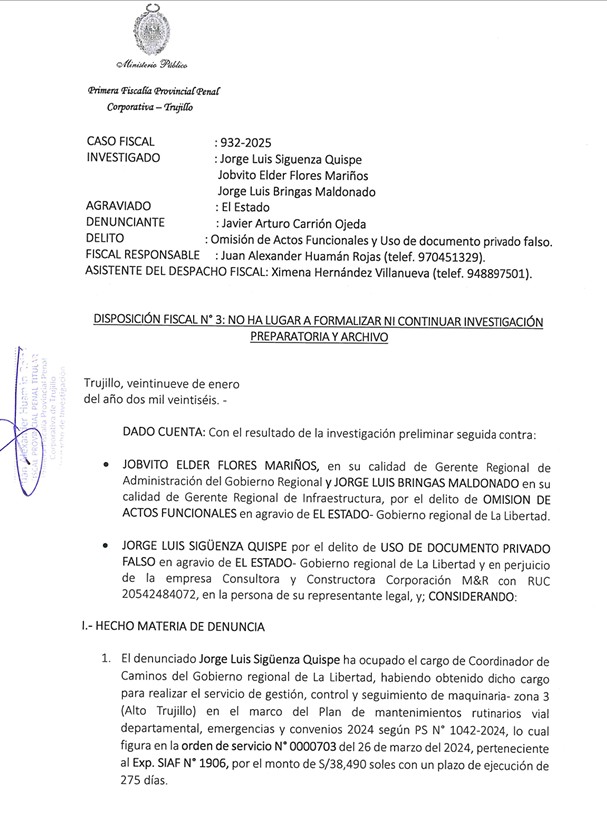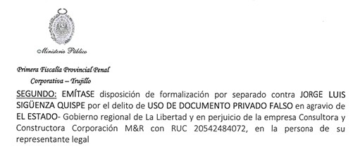 La Primera Fiscalía Provincial Penal Corporativa de Trujillo dispuso continuar la investigación preparatoria contra Sigüenza Quispe por el presunto delito de uso de documento privado falso, luego de determinar que habría presentado un certificado de trabajo apócrifo para acceder a una orden de servicio en la administración regional.