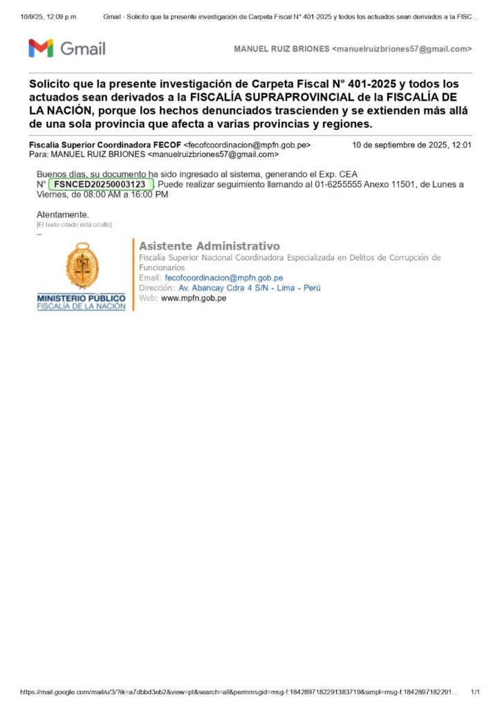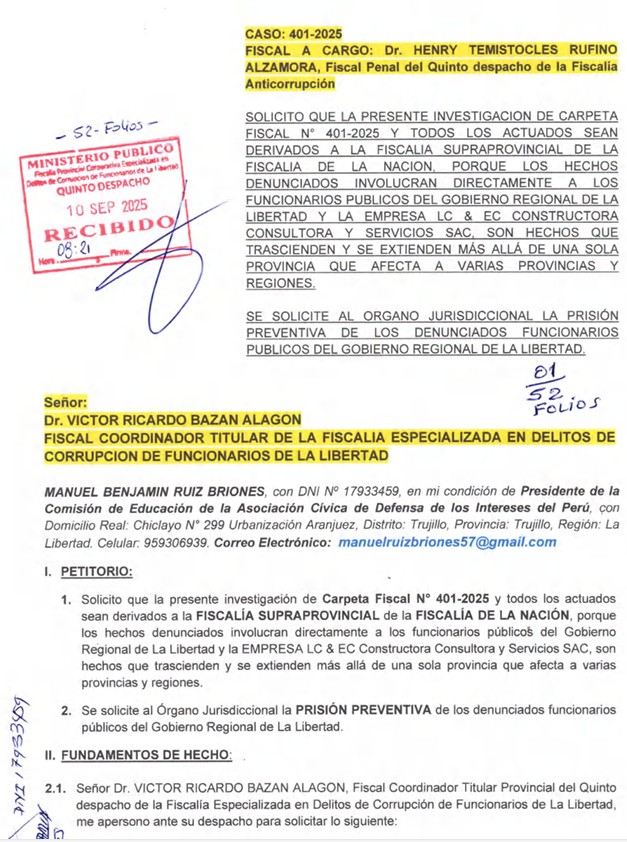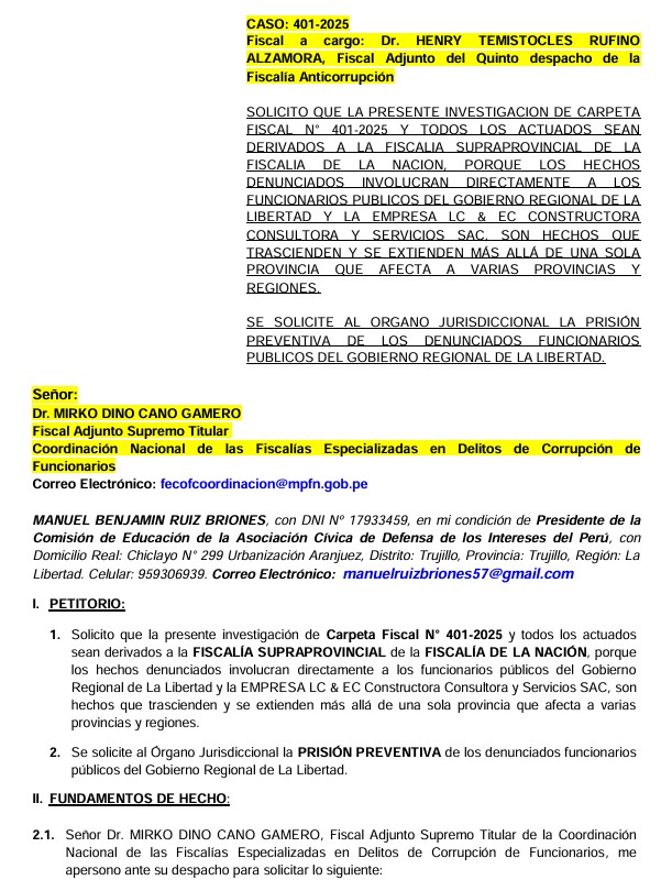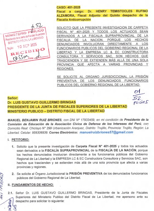 El denunciante, Manuel Benjamín Ruiz Briones, presidente de la Asociación Cívica de Defensa de los Intereses del Perú, sostiene que este caso “ya salió del alcance de la provincia de Trujillo, pues abarca ahora las provincias de Otuzco y Virú, además de las regiones de Loreto y Junín”. Por esa razón, solicita que la investigación sea asumida por la Fiscalía Supraprovincial de la Nación, instancia que investiga delitos de crimen organizado que trascienden varias jurisdicciones.
