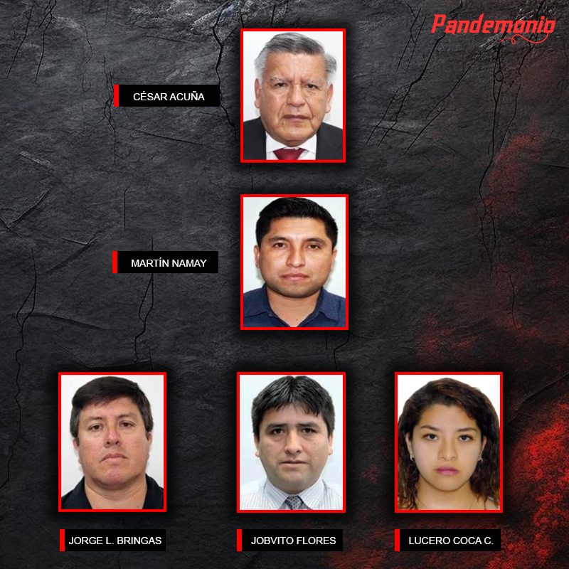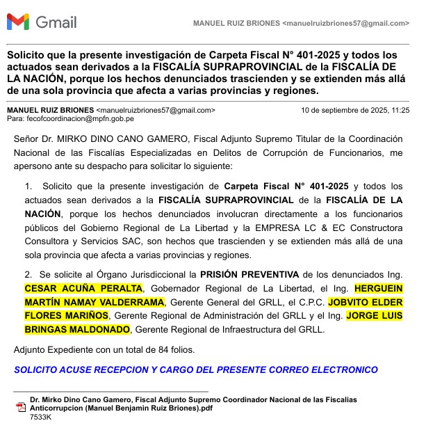 En su petitorio, Ruiz Briones también ha solicitado la prisión preventiva contra César Acuña Peralta y sus funcionarios Herguein Martín Namay Valderrama, Jobvito Elder Flores Mariños, Jorge Luis Bringas Maldonado, así como contra la empresaria Lucero Natalie Coca Condori. Además, ha requerido la intervención del Dr. Mirko Dijo Cano Gamero, Fiscal Supremo y Coordinador Nacional de las Fiscalías Especializadas en Delitos de Corrupción de Funcionarios, y del Dr. Luis Guillermo Bringas, presidente de la Junta de Fiscales Superiores de La Libertad.