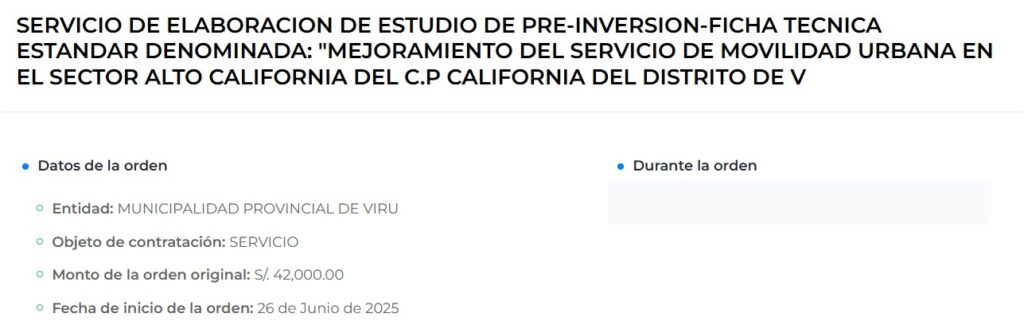 En ese contexto, Pandemonio detectó que Delgado Obando figura como proveedor del servicio de elaboración del estudio de preinversión – ficha técnica estándar denominada “Mejoramiento del servicio de movilidad urbana en el sector Alto California del C.P. California del distrito de Virú”, contratado por la Municipalidad Provincial de Virú por un monto de S/ 42,000.00. La orden de servicio tuvo como fecha de inicio el 26 de junio de 2025, cuando aún se encontraba en funciones en la comuna de La Esperanza.