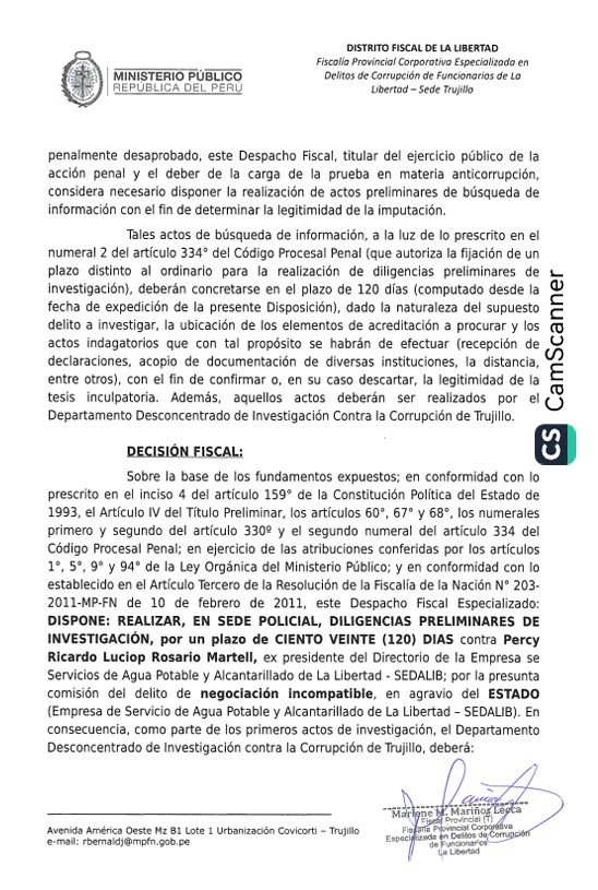 Unidad de Investigación Pandemonio.- La Fiscalía Provincial Corporativa Especializada en Delitos de Corrupción de Funcionarios de La Libertad inició una investigación preliminar por 120 días contra Percy Ricardo Lucio Rosario Martell, ex presidente del Directorio de la empresa estatal SEDALIB, por presuntas irregularidades en la adjudicación de contratos directos.