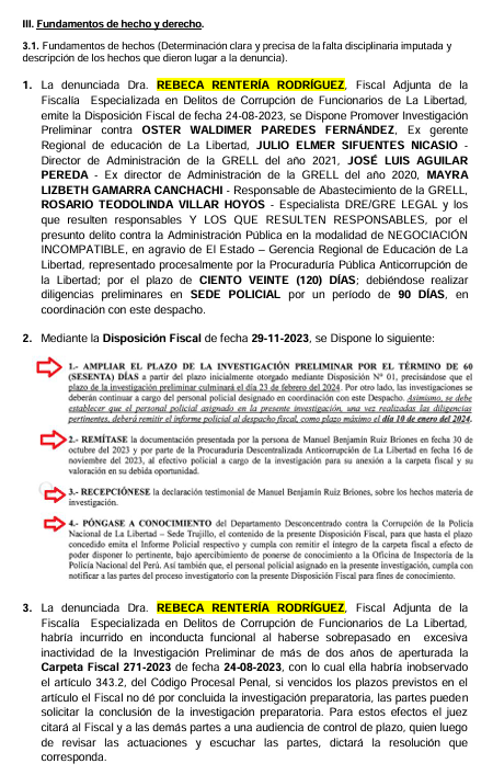De acuerdo con el escrito, la fiscal dispuso el 24 de agosto de 2023 promover investigación preliminar por el presunto delito de negociación incompatible contra el exgerente regional de Educación Oster Waldimer Paredes Fernández y otros exfuncionarios de la Gerencia Regional de Educación de La Libertad. Sin embargo, se alega que, pese a los plazos legales vigentes, la carpeta fiscal habría permanecido sin un impulso efectivo por más de dos años.