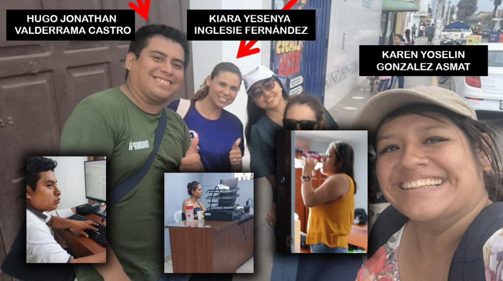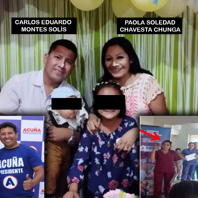 La documentación identifica a varios locadores asignados a distintas dependencias de la GRDIS —como la Subgerencia de Inclusión Social, la Subgerencia de Desarrollo Social, el Observatorio Regional y la Oficina Regional de Atención a las Personas con Discapacidad (OREDIS)— que, paralelamente, aparecerían en actividades vinculadas a la campaña política. Entre ellos figuran Carlos Eduardo Montes Solís y Paola Soledad Chavesta Chunga, esposos que trabajan bajo órdenes de servicio en dicha gerencia; mientras que el primero aparece con indumentaria de campaña, la segunda brindaría charlas como obstetriz desde oficinas de la misma gerencia.