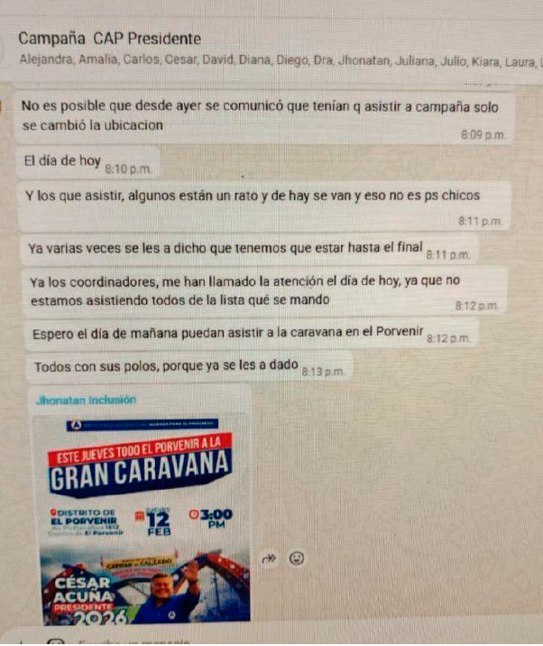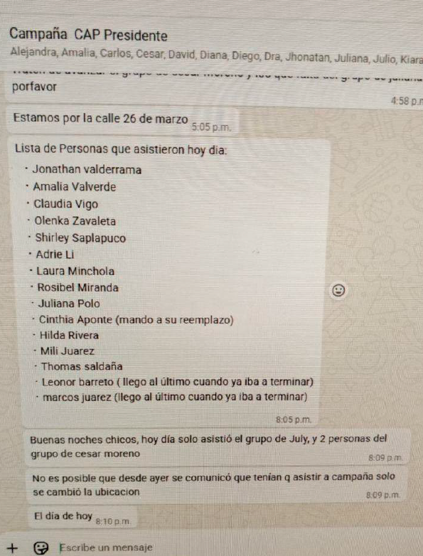 Uno de los elementos que refuerza la hipótesis de uso político del personal contratado son las capturas de conversaciones del grupo de WhatsApp denominado “Campaña CAP Presidente”, en el que presuntamente participan algunos de los locadores. En los registros revisados se evidenciarían coordinaciones relacionadas con actividades de campaña y organización territorial.
