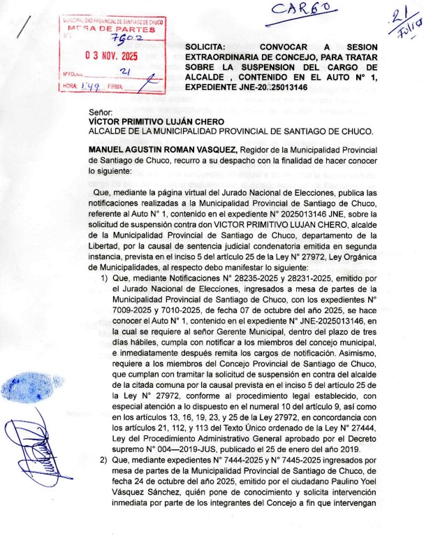 Unidad de Investigación Pandemonio.- Un nuevo episodio de tensión política se vive en la Municipalidad Provincial de Santiago de Chuco. El regidor Manuel Agustín Román Vásquez ha solicitado formalmente al alcalde Víctor Primitivo Luján Chero que convoque, en un plazo máximo de cinco días hábiles, a una Sesión Extraordinaria de Concejo Municipal con el fin de tratar su suspensión del cargo, luego de haber sido sentenciado judicialmente en segunda instancia.