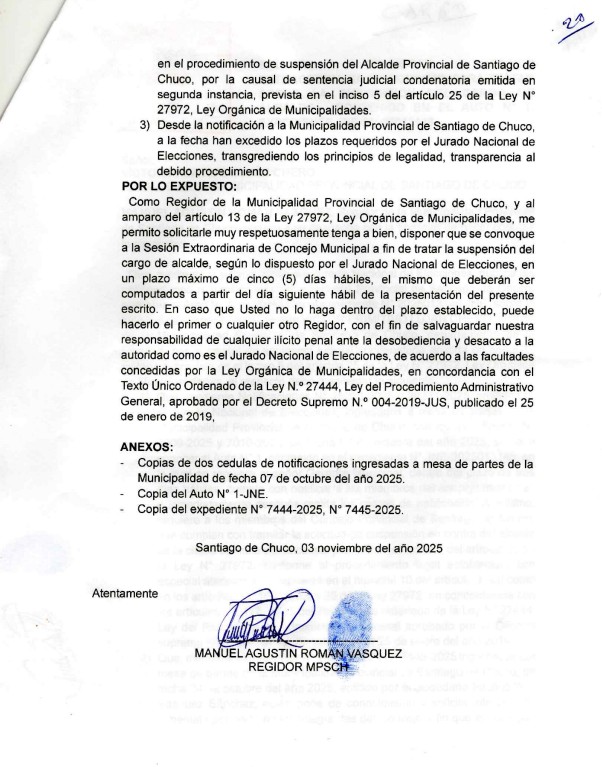 “Solicito que se convoque a sesión extraordinaria dentro de los cinco días hábiles, como corresponde por mandato del JNE. Si el alcalde no lo hace, lo haremos los regidores, para salvaguardar la institucionalidad y el cumplimiento de la ley”, señala el escrito presentado ante Mesa de Partes.