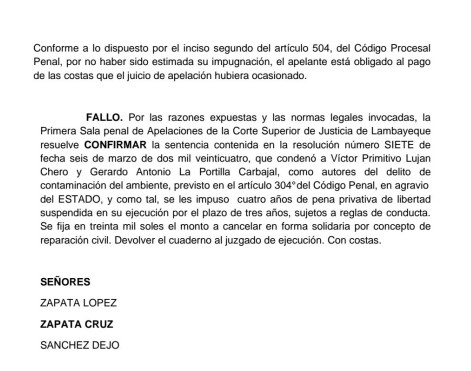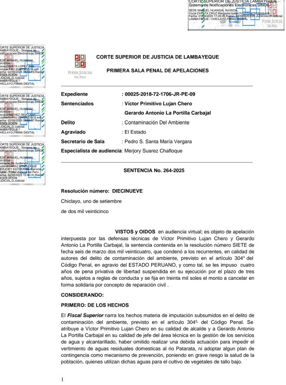 La solicitud de suspensión se basa en la Sentencia Condenatoria N.º 264-2025, emitida por la Primera Sala Penal de Apelaciones, que impuso al alcalde Víctor Primitivo Luján Chero una pena privativa de libertad de cuatro años, suspendida por tres años, además del pago de 100 días multa (equivalente a S/ 708) y una reparación civil de S/ 30 000 a favor de la parte agraviada.